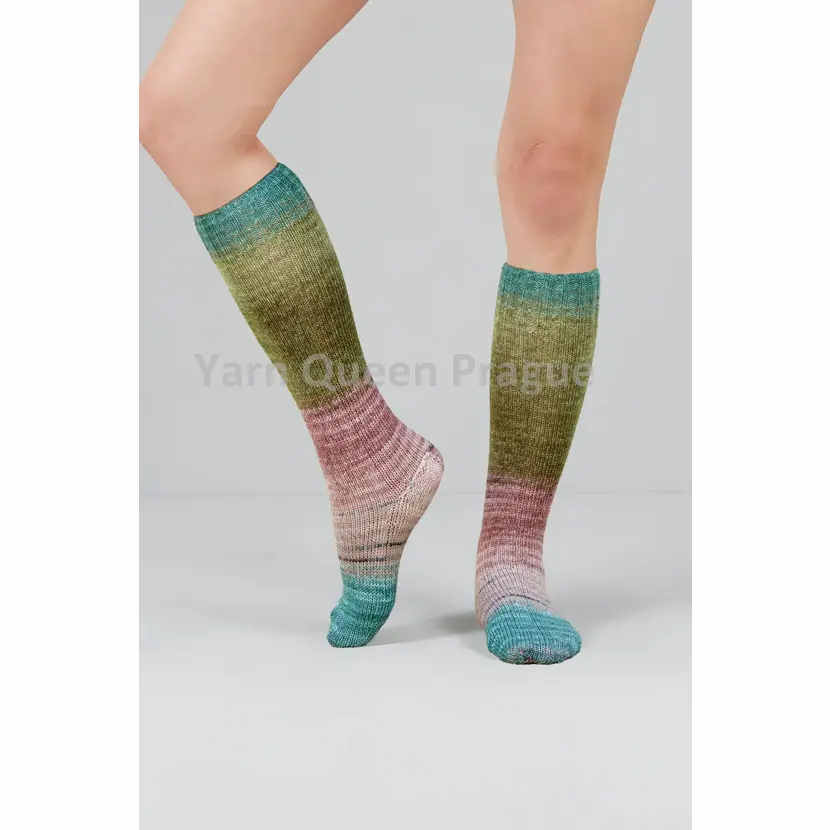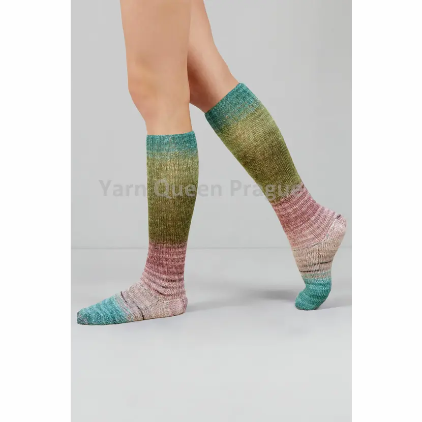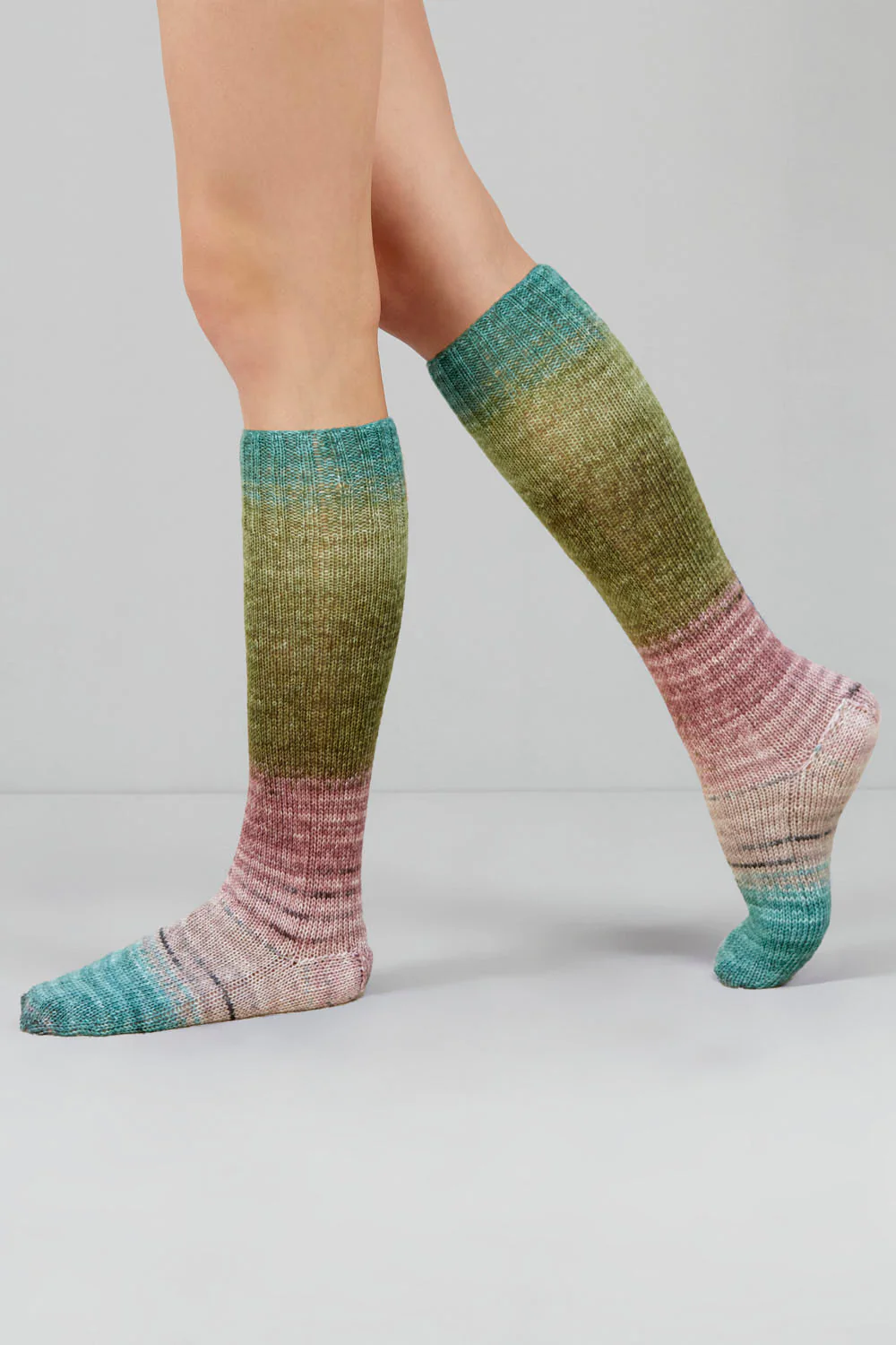 Ručně barvená Gusto Wool Echoes obsahuje 2 přadnénka po 50 gramech příze pro upletení identického páru ponožek.