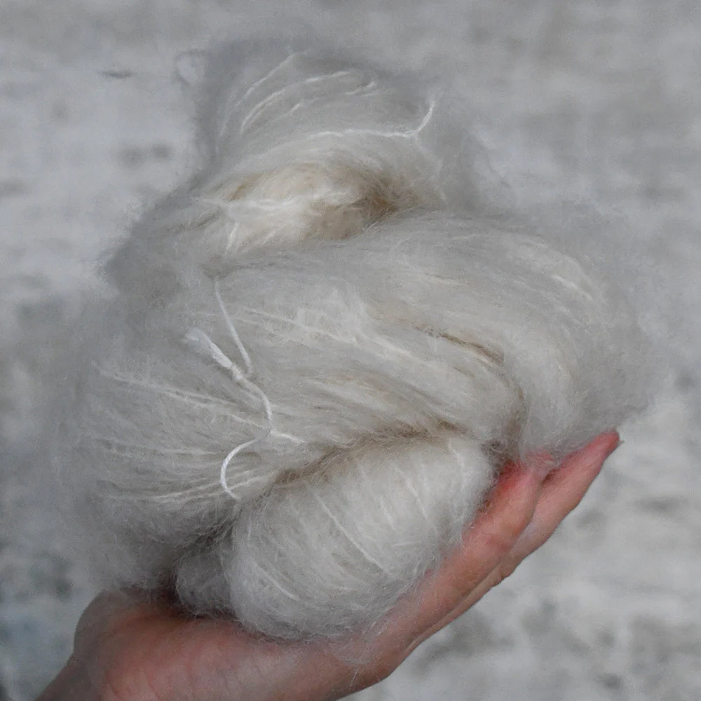 Česaný mohér, ze kterého vznikne nadýchaná pletenina s nádherným halo efektem.