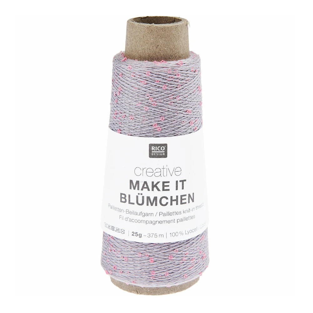 Creative Make It Blümchen je lesklá doplňková příze, která se nepoužívá samostatně, ale přidává se k jiné přízi během pletení či háčkování. Její hlavním účelem je dodat projektu elegantní a stylový vzhled díky jemným květinovým flitrům.