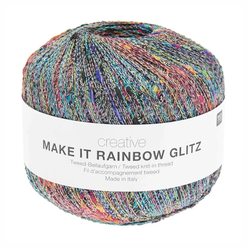 Creative Make It Rainbow Glitz je efektní doplňková příze s duhovým a třpytivým efektem, která se připlétá k jiné přízi. Vytváří tweedový vzhled s jemným leskem, ideální pro slavnostní doplňky, čepice, šály nebo detaily na svetrech.